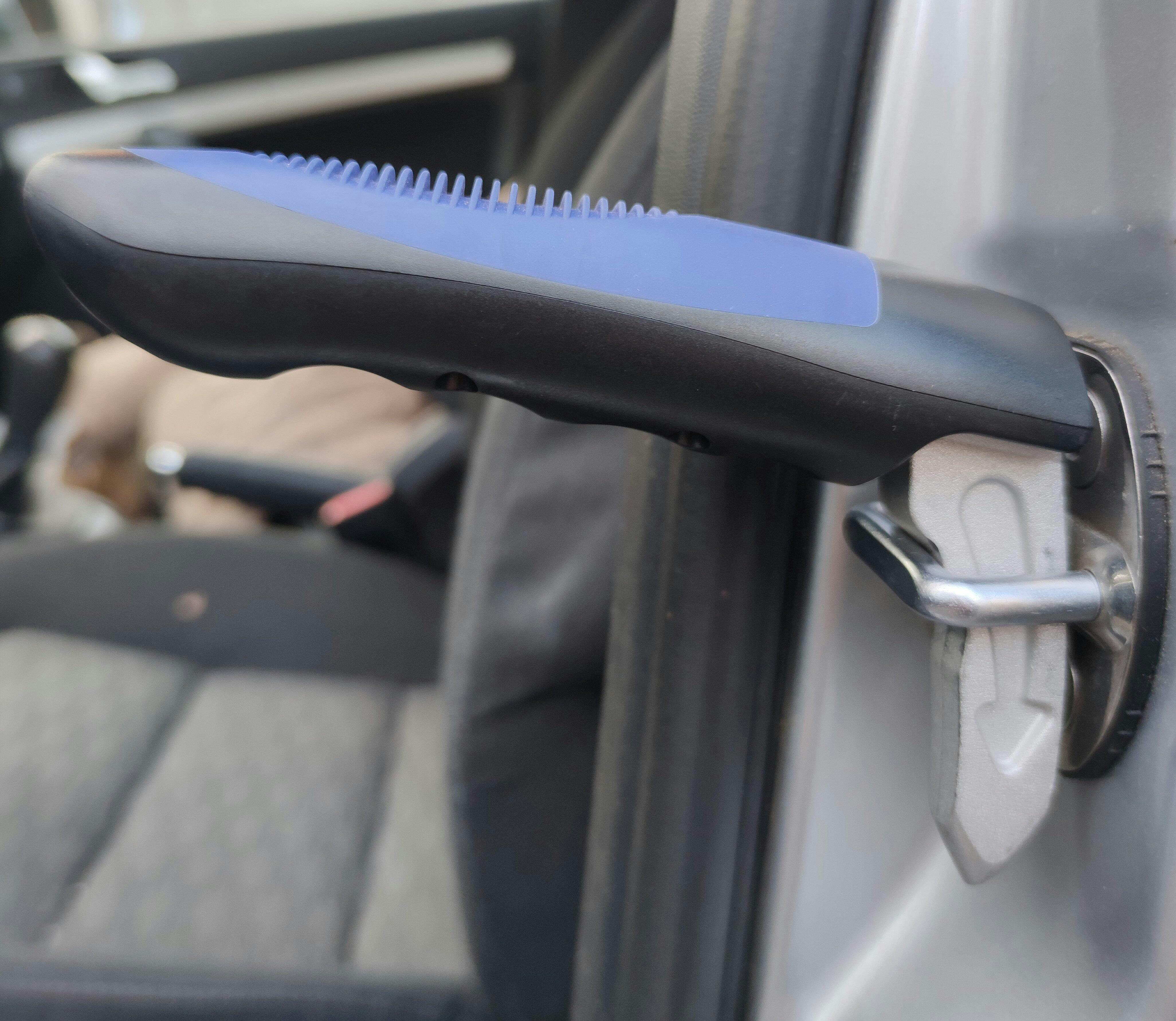 Der Griff rastet super ein und man kann sich an ihm sehr leicht aus dem Auto heben. Er passt an jedes Auto.